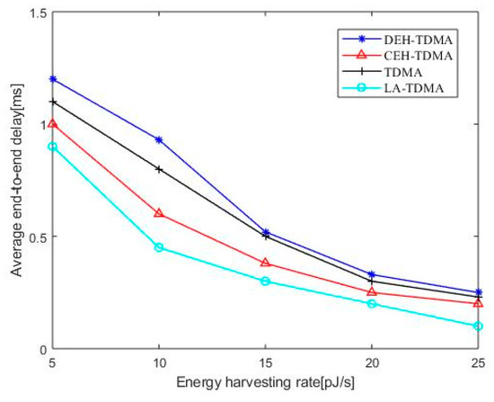 Figure 3 is an end-to-end delay comparison of four MAC protocols. As can be seen from the figure, the end-to-end delay decreases as the nano-node energy harvesting rate increases. This is because the nano-battery is charged faster when the energy harvesting rate is increased, which greatly reduces the probability that the node cannot complete the data transmission due to lack of energy, thereby shortening the waiting time of the data packet in the buffer area, thereby reducing the average end-to-end delay and increasing the data transmission amount of the network.