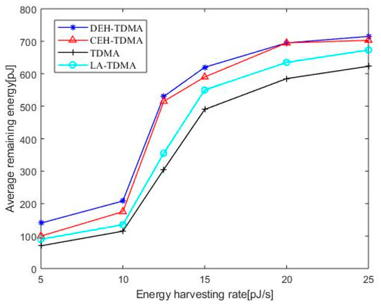 Figure 4 shows that DEH-TDMA and CEH-TDMA outperform TDMA and LA-TDMA in terms of average remaining energy, DEH-TDMA and CEH-TDMA have little difference in the average residual energy of the nodes because the self-powered nano-nodes in the network are energy-compensated.