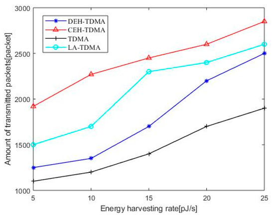 Figure 5 shows the comparison of packet transmissions amount for four protocols. As can be seen that the packet transmission amount increases as the node energy harvesting rate increases, because the speed of energy harvesting can reduce the probability that the node cannot complete the data transmission due to lack of energy.