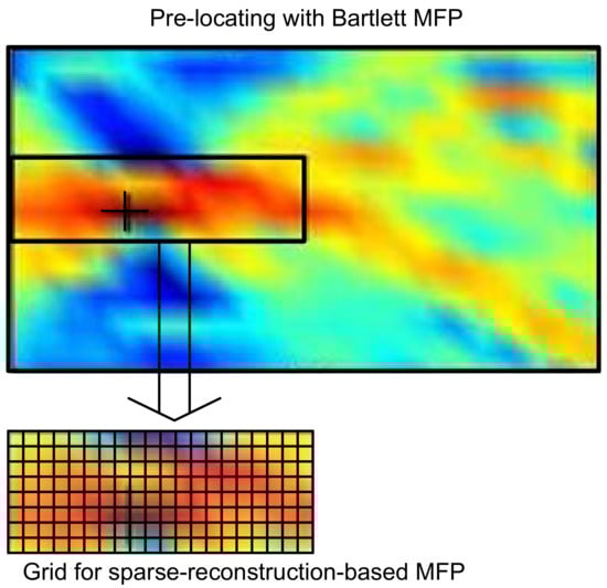 Since the MFP problem in our framework is performed on a grid, the accuracy depends on the grid size. However, it is computationally expensive to make the grid uniformly fine on the whole region. Malioutov et al. introduced the idea of adaptive grid refinement, in which the grid is refined around the source locations derived by the previous estimation []. Inspired by this, if we have obtained approximate knowledge of source locations using low resolution, but simple and robust methods, such as Bartlett MFP, the grid for sparse reconstruction-based MFP can be specified to cover only the regions where sources are located with a high probability, as shown in Figure 2 []. Multiple sub-regions may be selected for multiple targets’ localization. These regions can be treated as a whole, reconstructing the multi-targets at the same time; whereas the isolated regions can also be treated separately, largely reducing the computational load of sparse reconstruction algorithms. Pre-locating has some limitations while locating multiple sources, especially closely located sources or detecting a weak submerged target in the presence of a loud surface interferer. We observe that pre-locating works fine in the single-source scenario; hence, on a prior knowledge basis, we can skip pre-locating in the multi-source scenario.