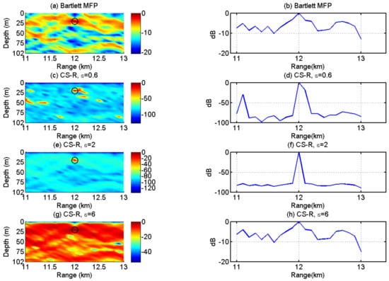 The results of Bartlett MFP and CS-R are shown in Figure 4, wherein CS-R can trade off between the -norm and -norm through the regularization parameter . The top row in Figure 4 shows that the Bartlett MFP has low resolution, and its side lobe level is rather high. As shown in Figure 4e,f, a good choice of is two; the ambiguity surface of CS-R has a sharp peak, and the peak corresponds to the source location. When is times 2, many peaks appear, shown in the Figure 4c,d; when is set at a higher value, 3 times 2 for example, CS-R degrades to the Bartlett MFP, and its side lobe level grows and main lobe broadens as shown in Figure 4g,h. Besides, the ambiguity surfaces of Bartlett and CS-R have the same multi-modal structure. The example illustrates two points. First, the choice of the parameter is very important; when the parameter is too large, CS-R degrades into Bartlett MFP, which is because the -norm of CS-R can be equivalent to Bartlett. In this case, an optimum value of the parameter is estimated to achieve a trade-off between high resolution and robustness.