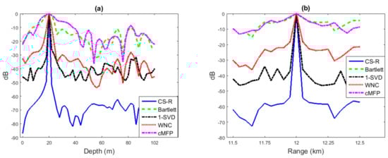 Similar to Bartlett, all those sparse reconstruction-based MFP methods do not require the sample covariance matrix to be full rank; thus, they also do not need a large number of snapshots. Our simulation and experimental data processing will focus on the snapshot deficient case, that is . In this section, we will use numerical simulation to verify that the CS-R method can give results similar to other existing adaptive processes, namely Bartlett, WNC, and 1-SVD. Firstly, we compare the ambiguity surface of CS-R to Bartlett MFP. Next, the source location estimation is performed for CS-R in comparison with Bartlett, WNC, and 1-SVD, followed by the performance analysis with environmental uncertainty.