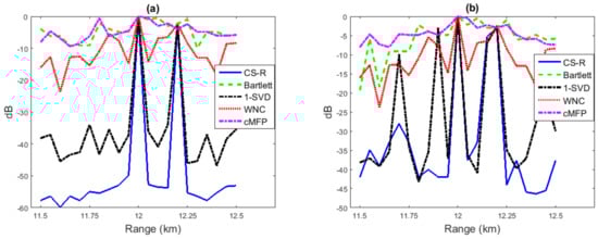 In Figure 6a, the locations of two sources, which have the same depth and are 0.4 km apart in range, are estimated; while Source 1 has a higher SNR (30 dB) and Source 2 exhibits weaker SNR (8 dB). It is observed that Bartlett and cMFP show many peaks higher than the Source 2 level. On the other hand, all other processes find the right peak location, and CS-R has lower sidelobes. Note that pre-locating is not implemented in the multi-source scenario for CS-R. It can be seen in Figure 6b that all processes suffer from a high side-lobe level when there is a 1% mismatch. Bartlett and cMFP again show many false peak locations other than sources. The WNC and CS-R processes perform better than 1-SVD.