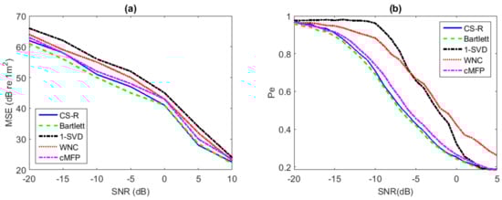 - In Figure 7a, we present plots of the the Mean Square Error (MSE) of each method versus SNR. The search for the source range location is between 5 and 15 km, and the depth is between 1 and 102 m.