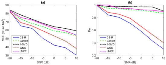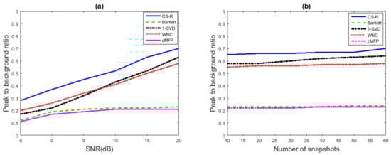 PBR of CS-R was compared with WNC, Bartlett, cMFP, and 1-SVD while changing different parameters, as shown in Figure 9. The obtained results showed the high resolution advantage of CS-R over other conventional methods in different challenging scenarios, e.g., snapshot deficient and low SNR. Although all processes can perform in the snapshot-deficient scenario, the purpose here is to show that, unlike some other methods, e.g., MVDR, our proposed method can also perform in those kinds of scenarios. We used 20 snapshots in Figure 9a and 20 dB in Figure 9b. We observe in Figure 9 that CS-R achieves PBR better than Bartlett and WNC and is close to 1-SVD. CS-R only struggled when the SNR was low, as shown in Figure 9a, but still exhibited slightly better results than Bartlett and WNC. Equation (30) below is used to calculate the PBR of different source location estimation methods [].