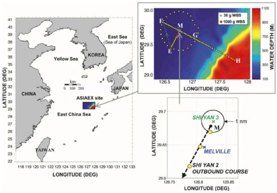Location of the Asian Seas International Acoustics Experiments (ASIAEX) East China Sea (ECS) experimental site. Clockwise from left: large-scale view reducing to a small scale (lower right) showing the positions of the Shi Yan 3 (receiver) and R/V Melville near position M and the outbound course of the R/V Shi Yan 2 (source) [].