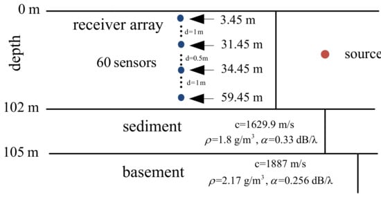 The Asian Seas International Acoustics Experiments (ASIAEX) were carried out in the spring of 2001 in the East China Sea (ECS) []. Here, we used part of the data from those experiments for our analysis. The site location is shown in Figure 10. The scenario for the shallow water experiment is shown in Figure 11. The water depth was about 102 m, and the acoustic field was received at a vertical line array consisting of 60 sensors. The source signal frequency was 630 Hz. Conductance Temperature Depth (CTD) sensors were used to calibrate the depth of the acoustic sensors and measure the Sound Speed Profile (SSP) of the water column. The SNR was about 15 dB. The range (determined by GPS coordinates) and depth (prior knowledge) of the source at the time of experiment (see Figure 12 at about 15 hours of time) was about km and 40 m, respectively.