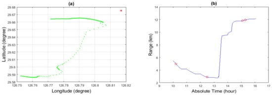 (a) Position of the Shi Yan 2 (red dot) and the movement of Shi Yan 3 (green line) from GPS coordinates; (b) change in distance between the source and receiver with respect to time. Red circle are showing the time and distance when the receiver is receiving the signal from the source.