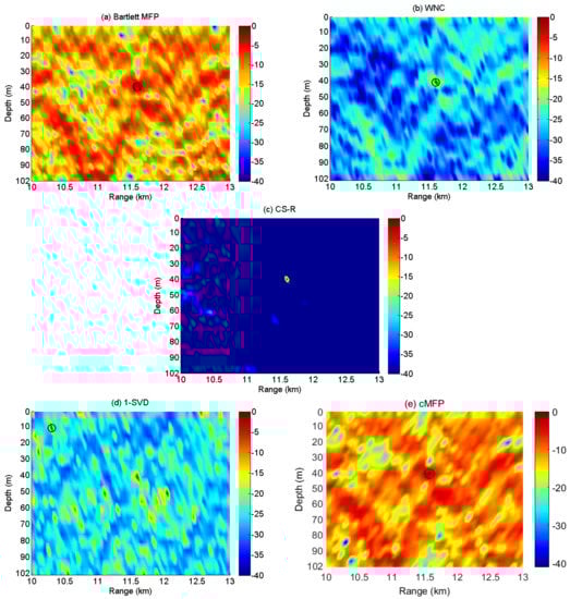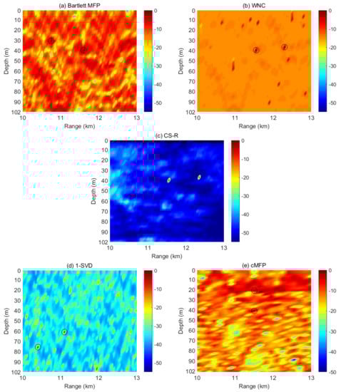 After removing noisy channels, we selected 42 sensors and 30 independent snapshots in utilizing experimental data; thus, the dimensionality of the received signal was , which is a snapshot-deficient scenario in the statisticalsense. The search interval for the source location was between 11 and 13 km and 1 and 102 m for range and depth, respectively. Pre-locating was implemented for CS-R, and the discretization of the search grid for CS-R remained the same for all other processes. Figure 13 summarizes the ambiguity surfaces of the Bartlett, WNC, 1-SVD, cMFP, and CS-R processes, respectively.
