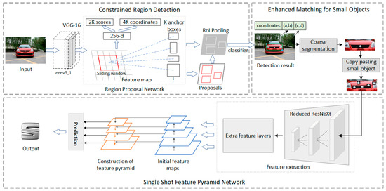 The overview diagram of our proposed VLR method is illustrated in Figure 1. The proposed method consists of three main parts. The first part is the constrained region detection module based on Faster-RCNN, which is used to extract the position information of the car head and tail. The entire image is forwarded through the VGG-16 network to obtain the last feature map (output of conv5/conv5_1 layer) with sufficient semantic information. Region proposal network is applied to the final feature map to generate numerous region proposals. Thereafter, the RoI pooling extracts the feature map of the target area through the generated region proposals. The accurate position information for the constrained region can be obtained through the classifier. The second part is enhanced matching for small objects, which consist of constrained region segmentation and copy-pasting strategy. By using the coordinates of the upper left and lower right corners of the detected candidate region, a constrained region containing the vehicle logos can be cropped from the original full image. Then, the copy-pasting strategy is adopted in the cropped image. The copy-pasting strategy is used in the training images to increase the overlap rate between the small ground-truth objects and predicted anchors in the CNN-based network. To make small objects sufficiently appear in each image that contains them, each image from the training set is augmented by copy-pasting vehicle logo many times. The enhanced matching method will be used on the SSFPD network proposed in third part. For the feature extraction module, a reduced ResNeXt network with high classification ability is adopted as base network to retain additional detailed information. A few additional feature layers are also added behind the ResNeXt to extract the initial feature. However, the generated initial feature maps with semantically weak features are insufficient for small object detection tasks. Therefore, a new feature pyramid with high-level semantics feature map is built on the network. These high-level semantic feature maps merged detailed information from the initial feature maps, which is beneficial for small objects recognition. The final result will be obtained through prediction on each high-level semantic feature map.