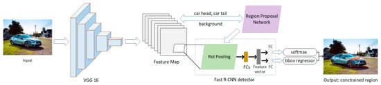 The constrained region detection network consists of three modules (see Figure 2): Feature extraction module (VGG 16), region proposal network (RPN), and Fast R-CNN detector. Joint training is possible because RPN and Fast R-CNN detector can share the same convolutional layers. Therefore, a deep network (e. g., VGG 16) with 13 shareable convolutional layers is used in the Faster R-CNN for feature extraction. RPN is a fully convolutional network, which takes the last shared convolutional feature map of VGG 16 as input and generates a set of rectangular region proposals with a wide range of scales and aspect ratios. Candidate objects may or may not be included in these regional proposals. For the generation of region proposals, an sliding window is convolved over the input feature map. Thereafter, two filters were used for the task of box-regression (reg) and box-classification (cls). Moreover, 4k outputs that can encode the coordinates of the k bounding boxes are generated by the reg layer. The 2K classification scores output by the cls layer are used to estimate the probability whether each proposal contains a car head, car tail or the background. Fast R-CNN detector, which is the third module, is applied to refine the generated region proposals. The region of interest (RoIs) is taken as input in this module. The RoI pooling layer converts features in the region proposals into fixed-length feature vectors through max-pooling operation. Each RoI feature vector will be provided to a series of fully connected (FC) layers. The accurate location information of the constrained region can be obtained through the softmax and bounding-box regressor.