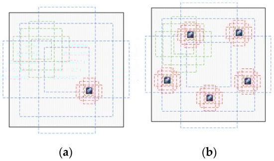 An enhanced matching method based on constrained region segment and copy-pasting strategy [40] is proposed in this section to improve the detection performance of small objects. Enhanced matching method is necessary in this paper. In most databases, only a small number of samples contain small objects, or the number of small targets is not enough in the sample containing small objects. These factors lead to the fact that the network has only a small part of the time to learn features of small objects during the training process. For majority of the existing CNNs, numerous anchors are generated by the anchor mechanism or region proposal network for object detection and classification. The greater number of anchors that positively match the ground-truth in the image, the greater the probability that the object will be detected. In other word, more positively matched anchors for small object can increase the contribution of small objects in calculating the loss function. To increase the number of positively matched anchors, this paper achieves data expansion by copying and pasting small objects into the training image multiple times. As shown in Figure 3a, there is less anchors positively matched with small logos. However, the number of positively matched anchors is significantly increased by using the copy-pasting strategy (see Figure 3b), which helps to improve the detection rate of small objects.