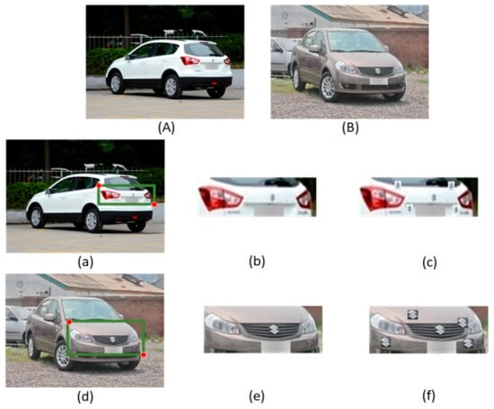 Process of constrained region segmentation and the copy-pasting strategy; (A) and (B) are original vehicle sample; (a) and (d) show the detected constrained region; (b) and (e) are the cropped constrained region; (c) and (f) show the images processed with “copy-pasting” strategy.
