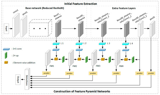 Inspired by the design strategy of SSD [39], extra feature layers are provided to the end of the reduced ResNeXt. Different from the original SSD, the feature maps generated by the base network and added layers are used to construct high-level semantic feature layers in the FPN network instead of directly for the predicting detection. The architecture of ResNeXt-101 is shown in Table 2. Instead of using the full network and obtaining the feature map at the last layer (resx33_elewise layer), the output of the resx7_elewise layer and res30_elewise layer are taken as initial feature maps. If the res33_elewise layer is used, then a high risk of losing the small objects is present owing to the substantially small resolution of this layer. These two feature layers that we adopted have output shapes of [] and [], which are lager than an ordinary feature map (with resolution) from the resx33_elewise layer in the original full network. Therefore, the outputs of the resx7_elewise and resx30_elewise layers are selected and extra feature layers are provided after the resx30_elewise layer. Furthermore, the extra feature layers decrease in size progressively and allow the feature extraction of objects at multiple scales. The four layers of Resx30_elewise_relu/Conv1_2, Resx30_elewise_relu/Conv2_2, Resx30_elewise_relu/Conv3_2, and pool2 are also used for the generation of the initial feature maps. Lastly, a feature pyramid network is generated on the basis of the initial feature maps to obtain additional semantic information.