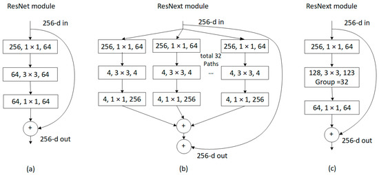 Different building blocks. (a): A block of ResNet (b): A block of ResNeXt with cardinality of 32. (c) A block equivalent to (b).