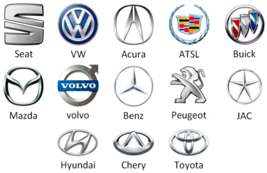 A few public benchmarks are available for VLD and VLC. Psyllos et al. [24] presented a dataset of 1200 frontal area images segmented from the Medialab LPR Database. Peng et al. [18] created a dataset with 3370 images covering 56 logo categories. All images in this dataset are captured from cameras placed at some major intersections. Huang et al. [20] provided a dataset containing 11,500 logo images belonging to 10 manufacturers. However, these datasets are not widely used. The datasets provided in [19,24] are extremely small. Evidently, testing on a set with limited number of images is inadequate to prove the robustness of the VLR methods. The dataset provided by Huang et al. [20] is sufficiently large, but images in various complex natural environments are not included. Consequently, the preceding datasets are not suitable for evaluating practical VLR methods. This paper generates a self-collected dataset called Common Vehicle Logo Dataset (CVLD). The images in the CVLD dataset are carefully selected from two vehicle-related benchmarks: Chinese City Parking Dataset (CCPD) [45] and Comprehensive Cars dataset (CompCars) [46]. The CVLD dataset has a total of 14950 images, including various poor outdoor imaging situations. The 13 classes of vehicle logos in this data set are shown in Figure 8. The resolution of these logos ranges from 10 × 10 pixels to 150 × 150 pixels, the majority of which are lower than 50 × 50 pixels.