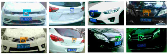 In our experiment, 13,000 images were used for training and 1950 images were used for testing. That is, each manufacturer has 1,000 images as training samples and 150 images as testing samples. Moreover, three additional testing sets with various situations are used to further demonstrate that the proposed method is considerably appropriate for real-world application. Table 3 shows that the CVLD_weather test set contains 920 images in the bad weather of fog, snow, and rain. The CVLD_night test set has 665 images at night. The CVLD_tilt test set includes 750 images with horizontal and vertical tilts of 15° to 45° and 15° to 45°, respectively. Some example images in our dataset are shown in Figure 9.