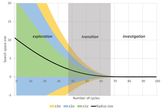 With an initial radius of size 10 and maximum cycles at 100, the black line shows the decrease of radius size, whereas the colored areas indicate the standard deviations of , , and . Multivariate Normal Distribution generates about 99.7% of the candidate solutions within these intervals. At around half of the cycles, the search shifts from exploration to investigation.