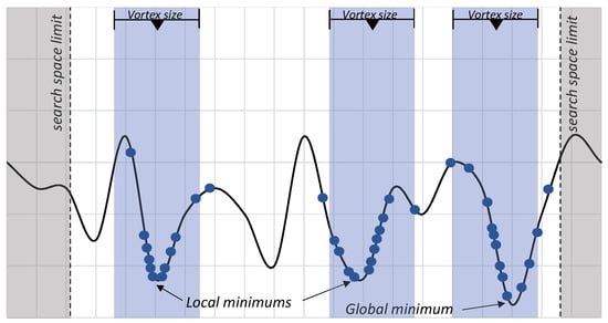 The first major difference is the complete elimination of Equation (25), which changes the vortex center positions, based on the vortex with the best result. By doing so, each vortex can proceed toward a minimum, whether local or global. This is intended to minimize the local solutions, as we can add more vortices to explore solutions independently. Figure 2 presents a hypothetical situation in which the vortices follow their paths towards the minima.