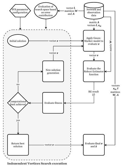 All of the REs (except for IRLS) require a numerical optimization method. The MH has to explore values for the parameters which generate the residuals from the Gauss–Markov model. The objective function of the RE is then evaluated and used for the computation of the solution fitness. Then, the MH generates new candidate solutions, continuing the process until it reaches a pre-defined limit [].