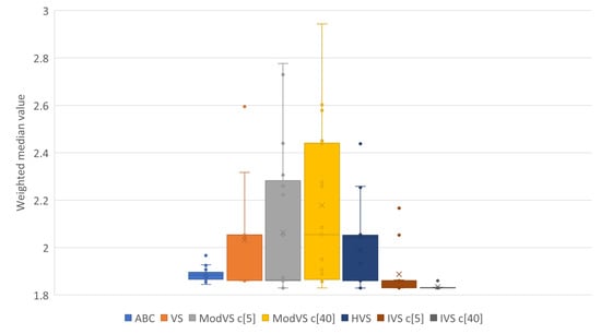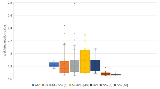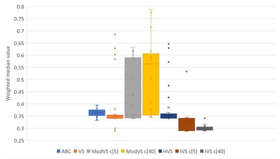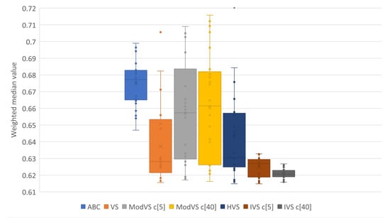 It is still possible to verify that the first two strategies have the possibility of a higher diversity of the candidates generated. By removing Equation (25), each vortex is allowed to go ahead with its search, not dragging them close to a vortex, with better overall results at the moment. The second strategy (Equation (26)) allows for greater diversification while generating the first results. This is because the MND, which uses the center of the vortex as the mean for candidate generation, generates more solutions near the center. With the centers of vortices more widely distributed, IVS should not concentrate candidates in only a part of the search space.