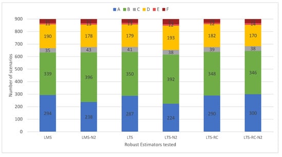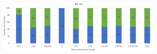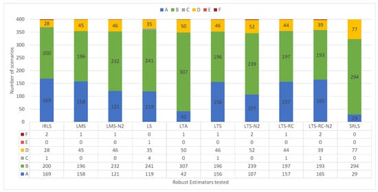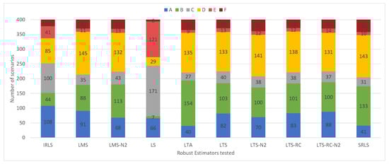 Starting with the outlier detection, Figure 15 gives the solution classifications for each RE in the 400 scenarios. LS presents its results concentrated in the ‘no false positives’ classifications (“A”, “C” and “E”). This shows a resistance for pointing out false positives in the residuals vector by LS solutions. The IRLS got the highest number of solutions classified as “A”, overcoming the other estimators. By checking the results for classifications that identified all outliers (“A” + “B”), the LMS, LTS, and LTS-RC-N2 had the best identification ability.