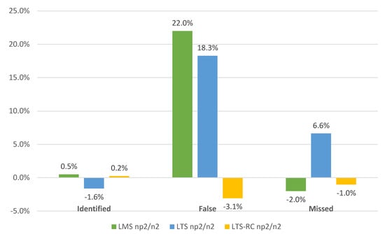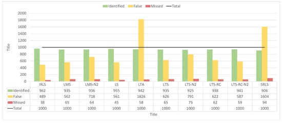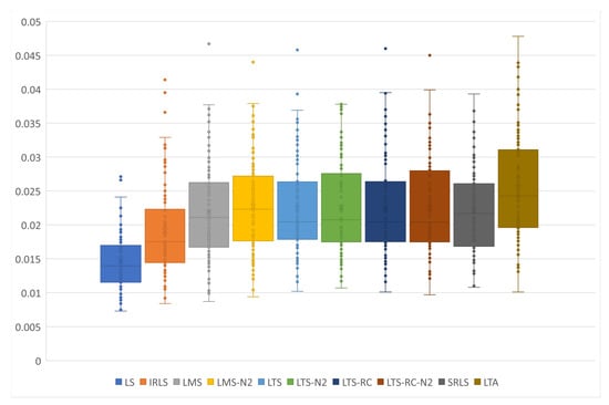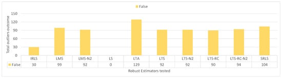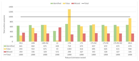 By counting the detected false positives and undetected outliers, all estimators pointed out most of the blunders, as can we see from Figure 18. For 1000 outliers, the values ranged from 906–962 for detection. As the detection of outliers is almost optimal, it remains to compare the amount of false positives, where IRLS, LS, LMS, and LTS-RC-N2 had the lowest false positive values, ranging from 489–587.