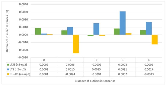 Table 3 presents the mean distance of solutions from the original co-ordinates. LS presented an unsatisfactory estimate for large outliers. The solution deteriorated, even with only one outlier of great magnitude. As we added more blunders to the scenarios, LS became one of the worst solutions for direct parameter estimation. LTA and SRLS also showed bad estimates, whereas most estimators presented similar, more satisfactory results, proving greater insensitivity to the outliers.