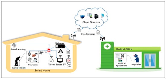 Overview of the system. The scenery is divided into two parts, the smart home and the medical office; they are connected by the cloud infrastructure.