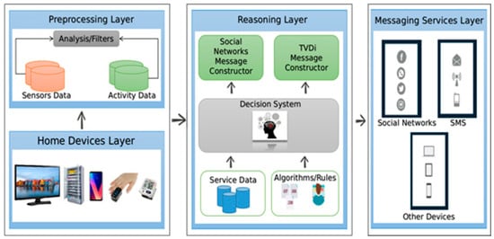 System architecture proposed to process data and send social network messages. There are four layers, which are responsible for data gathering, analysis, decision making, and messaging.