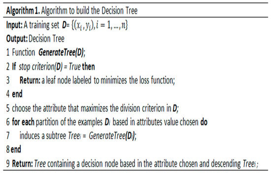 Our approach implements C4.5, RandomTree, and RepTree [65], which construct models based on binary rules. We use the output of the algorithms to generate automatic services for health teams and relatives to accompany the patient’s treatment. The generic algorithm for constructing a decision tree was adapted from Cramér [66] and presented in Figure 3.