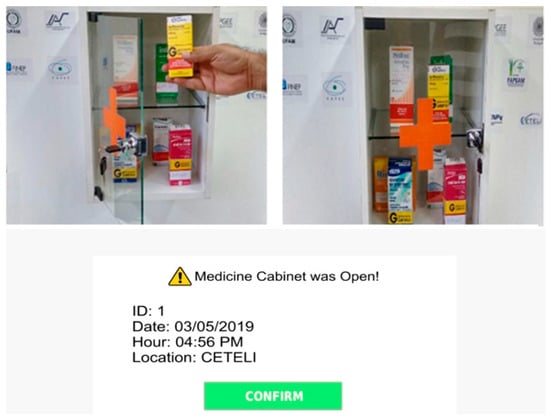 In recent years, the cabinet’s functionalities were expanded; now it can connect to the cloud and has a voice synthesizer and a facial recognition system to aid in the collection of patient data. Its application provides real-time logging of the activities identified by the sensors. Figure 4 shows the ID from the patient’s RFID card, the date, time, and location of the cabinet opening, illustrating some of the data collected by the system.