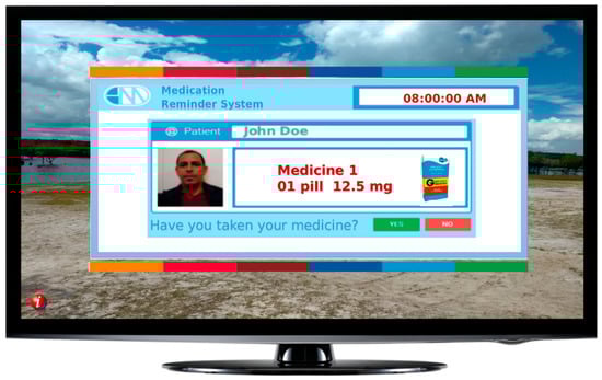 The system’s architecture, with four layers, was built to allow the incorporation of devices into an application layer for electronic messages. Based on the medical prescription, the system fires diverse communication alerts to warn patients about the correct intake of medication. The primary interface device is a TV set that advises, through well-designed messages, what the patients should do at that time; e.g., take medicine or measure blood pressure. A collection of alternative communication approaches was incorporated into the system that can also reach the patient through a message to one smartphone or reach relatives and caregivers through social networks.