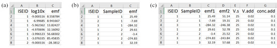 The structure of the data files for an array of three ISEs is shown for calibration data (Figure 2a), experimental data in the Basic format (Figure 2b), and experimental data in the Standard Addition format (Figure 2c).