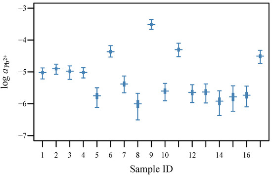 From this, we see that ISE #1 had close to the ideal Nernstian slope, estimated as b = 29.5 mV/decade (95% CI 25.6–34.3 mV/decade), with an LOD near 10-6. This information can be used when developing new ISEs and when testing whether they are fit for purpose [13]. For example, lead activity for some of the experimental soil samples (Figure 4) was near this LOD, indicating that, by itself, ISE #1 would struggle to distinguish the lower activities at this site from a blank. If the full distribution of the parameters was of interest, plot(lead.analysis1) would be used instead.