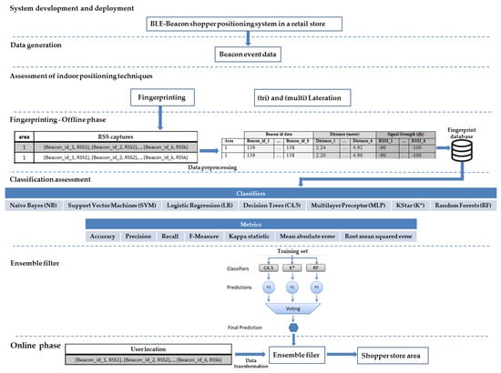 Since indoor localization in retail environments is still unexplored, this study started by assessing the performance of the most common techniques for indoor positioning (i.e., trilateration and fingerprinting) and established classifiers. It was found that the random forest is the best classifier. However, this study moved on to proposing and assessing an ensemble filter. The absolute mean and root mean squared errors of the ensemble filter are significantly lower (40.7% and 18% lower, respectively). More specifically, for approximately 70% of our cases (captured events of consumers), the ensemble method results in a localization error of less than 1 m and in 80% of the cases, the localization error is approximately 2 m. On the contrary, for the random forest, in 80% of the cases, the localization error is approximately 2.5 m.