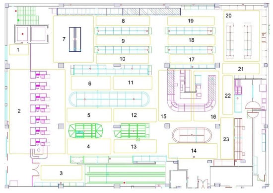 Figure 3. Map of the BLE beacon-enabled ground floor of the grocery store (store areas are labelled with a number from 1 to 23, beacons are presented in red circles, elevator beacons are filled with red color).