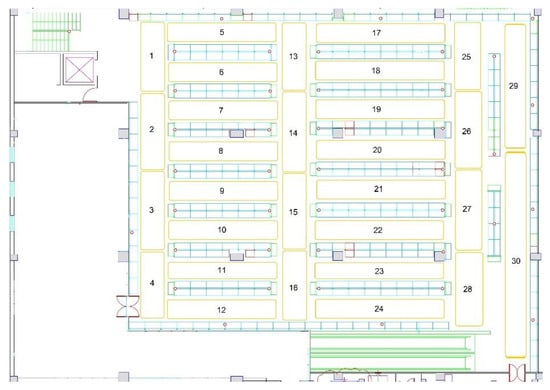 Figure 4. Map of the BLE beacon-enabled first floor of the grocery store (store areas are labelled with a number from 1 to 30, beacons are presented in red circles).