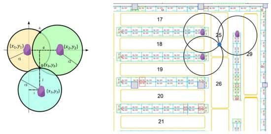 As shown in Figure 5, the coordinates of each beacon (i.e., B e a c o n 1 ( x 1 ,   y 1 ), B e a c o n 2 ( x 2 ,   y 2 ), B e a c o n 3 ( x 3 ,   y 3 )) were utilized to determine the coordinates of the target point B, which indicates the location of the shopper. In order to calculate the coordinates of B( x b ), it is treated as the intersection of 3 circles, whose centers are the locations of the 3 beacons B e a c o n i ( x i ,   y i ), for i = 1, 2, 3. The distances between each beacon and the shopper are the radii of each circle. For each circle the equation is: