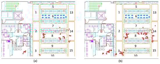 Figure 6 presents two indicative evaluation cases of trilateration and multilateration in the store, respectively. The blue arrow in both examples (a and b) highlights a shopper’s route that he moved across aisle 6 and, then, returned to the point where the shopper initially started. In the first case (Figure 6a), the data from the closest (in distance) to the shopper’s mobile device three beacons was utilized. Notably, the red dots, which are the outcome of the trilateration function, fall into an entirely different aisle and even outside the boundaries of the floor (bottom-left red dots). The distance error between the actual consumer’s position and the estimated varies from 5 to 10 m. In the second case (Figure 6), the six closest beacons were used to identify the shopper’s location. Similarly, this study found the consumer to be in entirely different areas than the actual ones (see the red dots). To improve the results, additional logic was even employed for manipulating the trilateration data, such as rejecting results (dots in the figures) that are not valid or have major deviations from the previous estimations. Nonetheless, the results were not significantly improved, as they were already very inaccurate. Thus, the authors realized that both trilateration and multilateration are not appropriate approaches for accurate indoor positioning in a retail store.