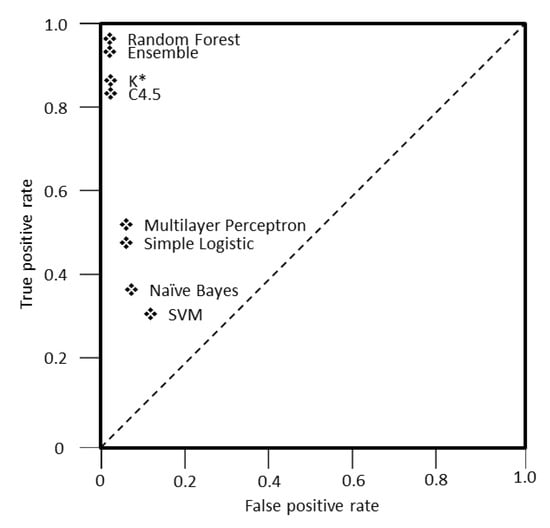 The most commonly used classifiers were selected, which have already been mentioned. Indeed, the following seven approaches were executed: (i) Naïve Bayes (NB) [69]; (ii) support vector machines (SVM) [70]; (iii) logistic regression (LR) [71]; (iv) decision trees (C4.5) [72]; (v) multilayer perceptron neural networks model (MLP) [73]; (vi) KStar (K*) [74] and (vii) random forests (RF) [32]. Naïve Bayes was selected as it is one of the simplest classification algorithms with strong independence assumptions between the features. Additionally, logistic regression was selected to examine the classification problem as a generalized linear model and KStar, an entropy-based algorithm for investigating their performance in such classification cases. Weka software was used for our experiments [75].