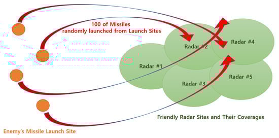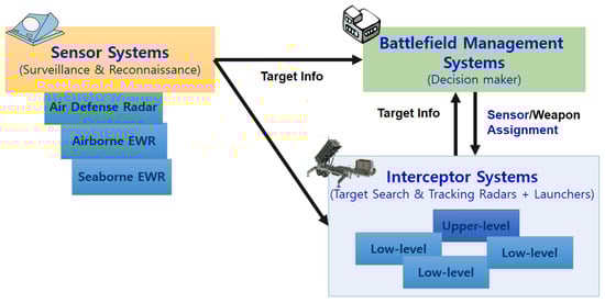 The rapid development of computer and communications technologies since the 1980s led to a new doctrine in the military field of the United States under the name of Network-Centric Warfare (NCW) between the late 1990s and early 2000s [,]. The introduction of this concept enabled faster and better decision making on the battlefield, based on integrated situational awareness through the convergence and processing of information gathered by the networked sensors. Platforms in charge of attack or defense became able to respond quickly to enemy threats, using the integrated sensors and shooters, according to these decisions. The typical example of these networked systems-of-systems in the military field is the ballistic missile defense system []. The ballistic missile defense systems consist of precise surveillance radar networks with various types of platforms such as early warning radar and local air defense radar, and their combined intercept weapon systems [].