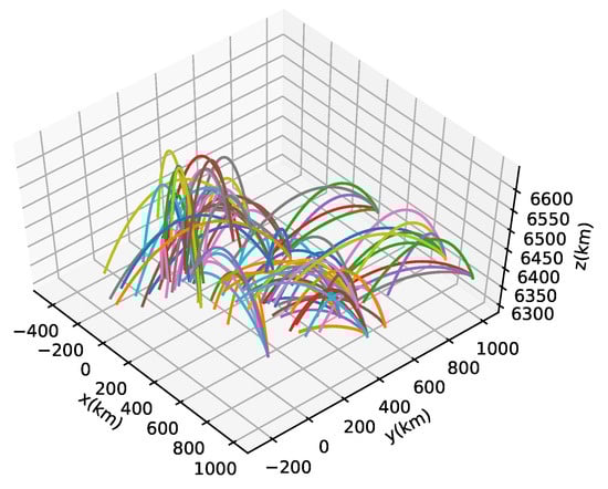 Here, acceleration regarding Coriolis force can be added according to the coordinate system []. In Equation (3), T stands for the thrust magnitude, m stands for target mass, stands for the unit vector which indicates thrust direction, stands for the Earth’s gravitational constant, x stands for the vector from the Earth center to the target, stands for the air density, h denotes target altitude, stands for the ballistic coefficient, and v denotes the target velocity vector. Based on this, the trajectories of the ballistic targets in the Earth-Centered Earth-Fixed (ECEF) coordinate systems were generated, as can be seen in Figure 2.