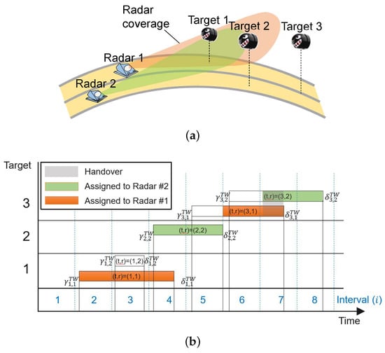 A toy version of the scheduling problem with three targets and two radars is shown in Figure 3. Given knowledge about each target’s trajectory and a set of radars, time windows for each target–radar pair can be calculated to ensure the maximum radar coverage. The time windows can be calculated simply by checking whether a target is inside the coverage of the radar or not; the coverage and assignments of each radar are colored differently depending on the radar. Suppose that each radar can track only a single target at a given time (), and the quality of measurement from a single radar is sufficiently high that simultaneous tracking by multiple radars is not needed in the given instance. The assignment results for the situation in Figure 3a are obtained as in Figure 3b. For Target , since Time Window includes Time Window , only Radar tracks the target. For Target , tracks it because the time window exists only for . For , tracks first because Time Window starts before Time Window , and then hands over the target to at Interval 7. For stable tracking, both radars and simultaneously measure the target during the handover period in Interval 7. The planning horizon is divided into intervals of equal length for checking tracking status. Let us look at the results for Intervals 5 and 6 in Figure 3b. Because, from the assumption of the problem, each radar can track only a single target, the assignment in Time Window starts from the release time of Interval 6, , rather than the release time of , , and the time interval corresponding to Interval 5 of Time Window is excluded. The assignment to Time Window continues until . After the handover from to , tracks until Time Window is finished.
