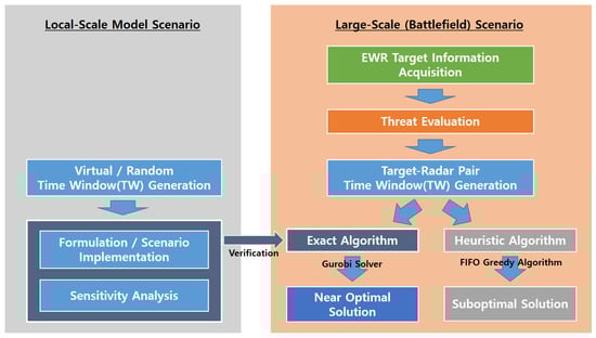 Two experimental models were tested to verify the effectiveness of the algorithm, as shown in Figure 4. The first scenario verified the effectiveness of the exact algorithm using a local-scale model for easy parameter modification. The second scenario verified the practical applicability of the algorithm by introducing two approaches for the large-scale (battlefield) scenario, which considered far more virtual targets and radars than were used in the local-scale model.