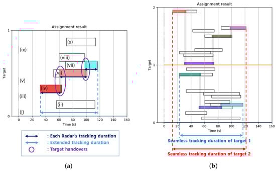 As can be seen in Figure 5a, among the 10 radars, six radars were involved in target tracking, because the probability that each radar can participate in tracking the target was set as equal to or less than 60%. Two target handovers occurred in the relevant sections of (iv)–(vi) at 60 s and (vi)–(vii) at 97 s, and the time window was selected to keep track of the target for as long as possible while maintaining the minimum takeover time as designed in the objective function. What is unique here is that, although Time Window (ii) is longer than any of the others, the solver assigned targets to Time Windows (vi) and (vii) to track the target as long as possible and at the same time to meet the constraint of the minimum tracking assignment time. On top of the conditions given in the results shown in Figure 5a, Figure 5b shows the results of the tracking assignment of 20 radars for two targets, as well as results for adding one more target and 10 more radars. These results also show that radar resources were well assigned to reflect the designed objective function and the constraints, such that the first target required two handovers and the second target required three handovers to achieve maximum tracking of each target.