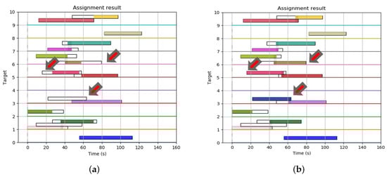 Using the parameters in Table 3, Figure 6a depicts the optimal scheduling results for tracking 10 targets with three radars. For each target, depending on the detection probability of 60% mentioned above, we can confirm that 1–3 radars were assigned to all targets except for the fourth target, which could not be detected and tracked in this simulation condition. Figure 6b depicts what happens when the radar’s simultaneous tracking capability () is adjusted to 3. The most noticeable thing is that the tracking durations of the fourth, sixth and seventh targets increased dramatically, as shown by the red colored arrows in Figure 6. Especially, it was possible to track the fourth target only in the time window of the first radar, as shown in Figure 6a; however, as increased, the target could be tracked in all available time window sections of the first and second radar, as shown in Figure 6b. In addition, considering the number of targets being tracked at 70 s in Figure 6, it can be seen in Figure 6b that seven targets could be tracked, while six targets could be tracked in Figure 6a. Thus, although there is a difference in degree, as the tracking ability improved, the tracking time for the entire target generally improved, as shown in Table 4.