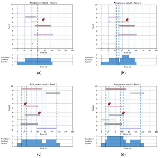 Optimal scheduling assignment result of each radar site according to the change of simultaneous tracking capability. (a) Assignment result of first radar when . (b) Assignment result of first radar when . (c) Assignment result of second radar when . (d) Assignment result of second radar when .