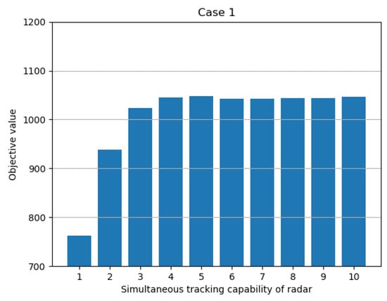 Figure 8 shows how the results varied with the simultaneous tracking capability. As shown in Table 4, the result of the objective function initially increased when increased. However, it can be seen that, after a certain level, the result of the objective function was not significantly affected. This tendency was only the result of a given condition, and, when the condition changed, a point that was not affected by the change of could be changed. Specifically, if the simultaneous tracking capability of the radar covered the number of targets, the influence of would be insignificant. If the number of targets to be tracked were greater than the simultaneous tracking capability of the radar, when the value of is high, the objective value would also rise, as shown in Figure 8, until the radars can cover all the targets.