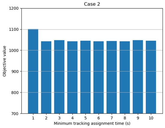 The second parameter that affects the value of the objective function is the minimum tracking assignment time. This parameter is the minimum time required for a radar to track a target, and physically refers to the time it takes for the radar filter system to stabilize the target tracking. Figure 9 shows the objective value according to the change of the minimum tracking assignment time. As can be seen in the figure, smaller minimum tracking assignment times led to higher levels of assignment, but the assignment was not affected after a certain level of minimum tracking assignment time.